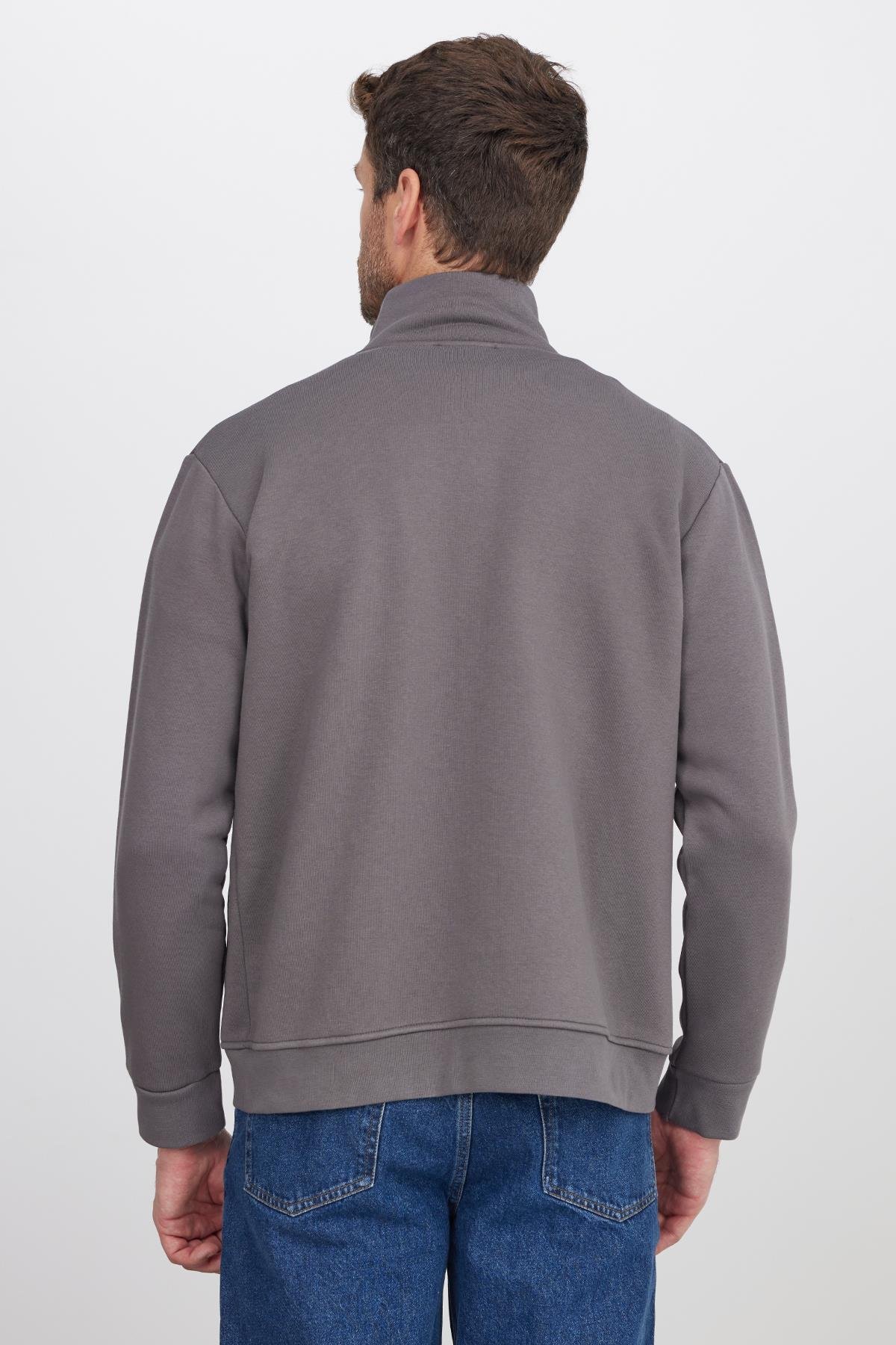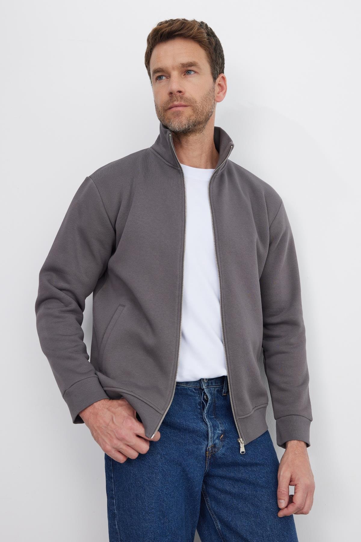 Unisex Relax Fit Rahat Kesim Pamuklu İçi Polarlı Fermuarlı Gri Dik Yaka Flato Cepli Sweatshirt Hırka