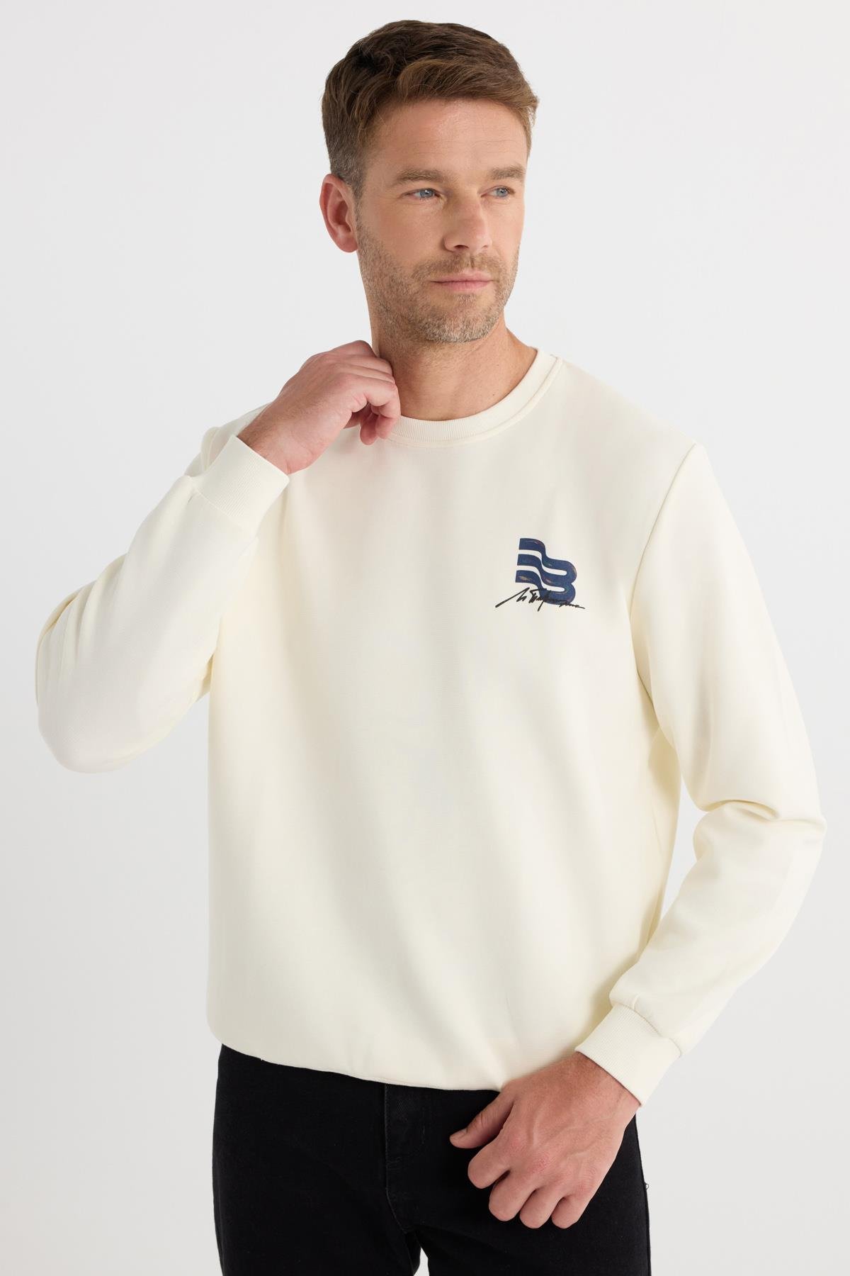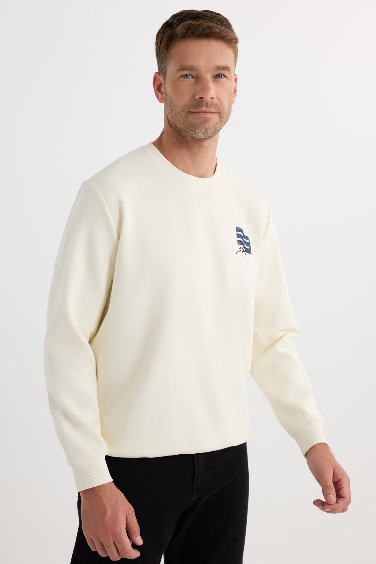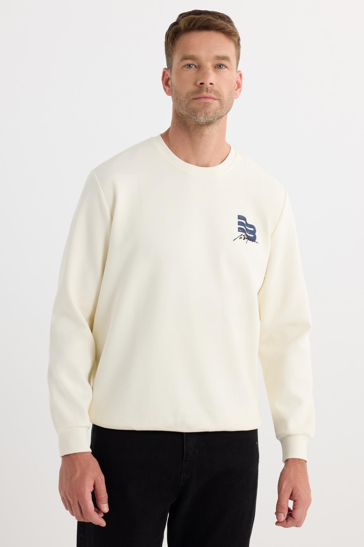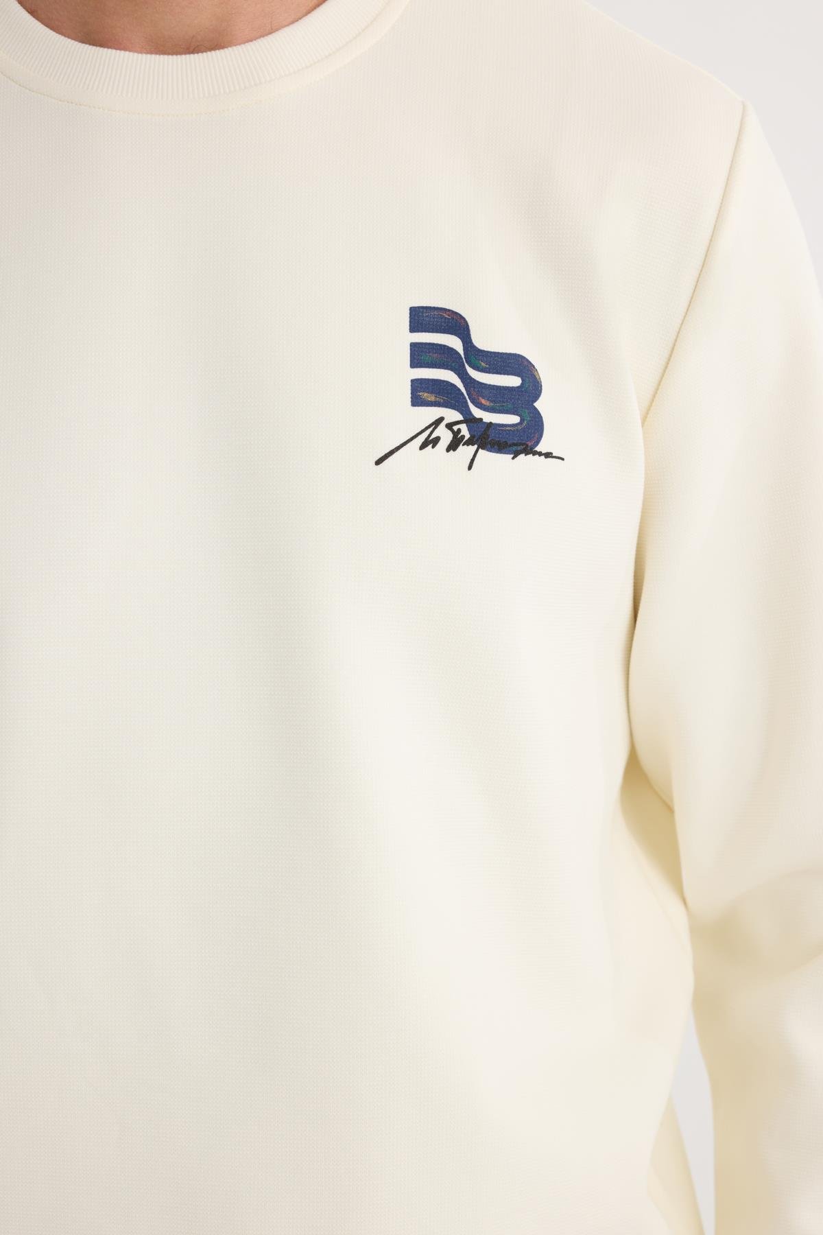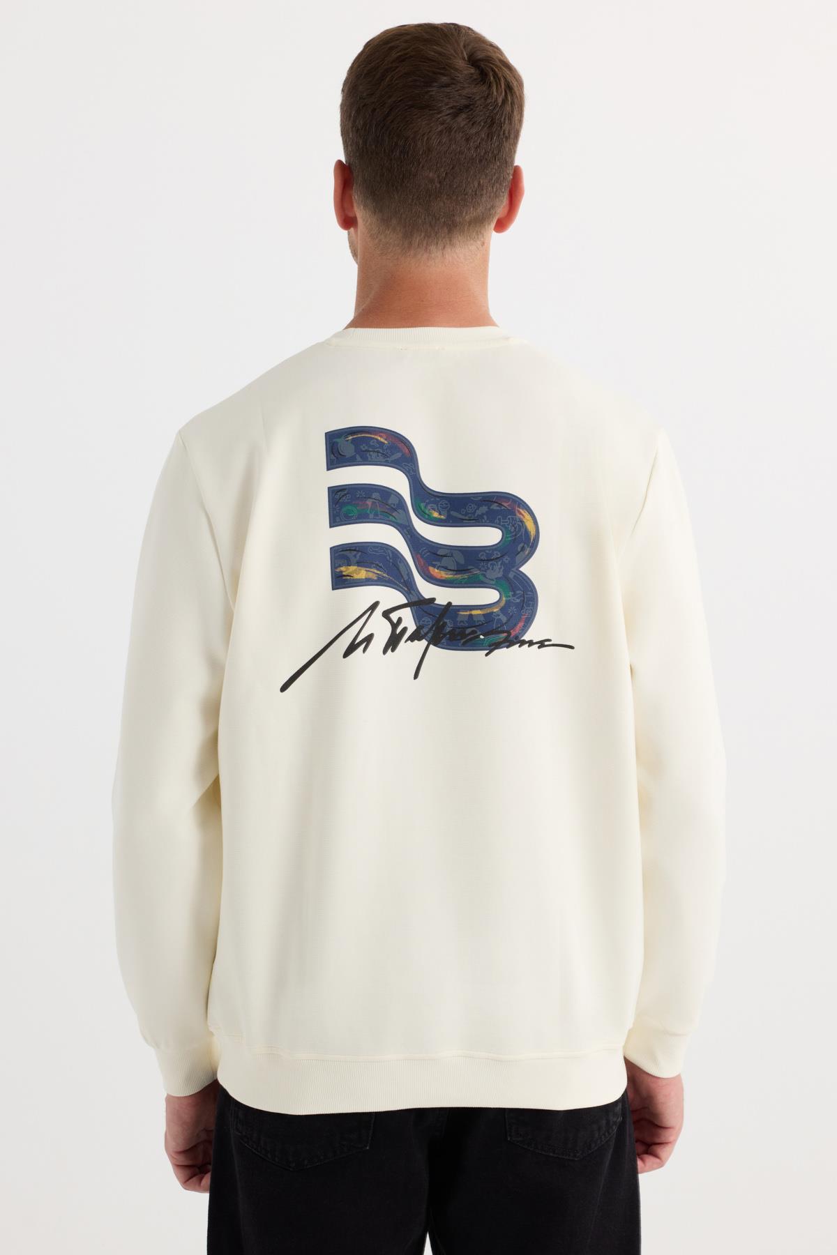 Unisex Relax Fit Rahat Kesim Pamuklu Yumuşak Dokulu Bisklet Yaka İç Polarlı Baskılı Ekru Sweatshirt